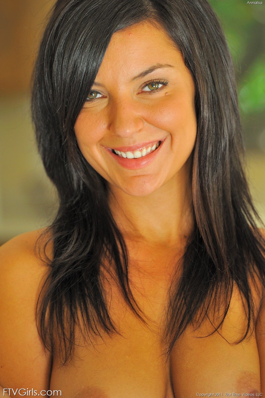 Raven-haired babe Annalisa peels her bikini off and rubs her clit by the pool