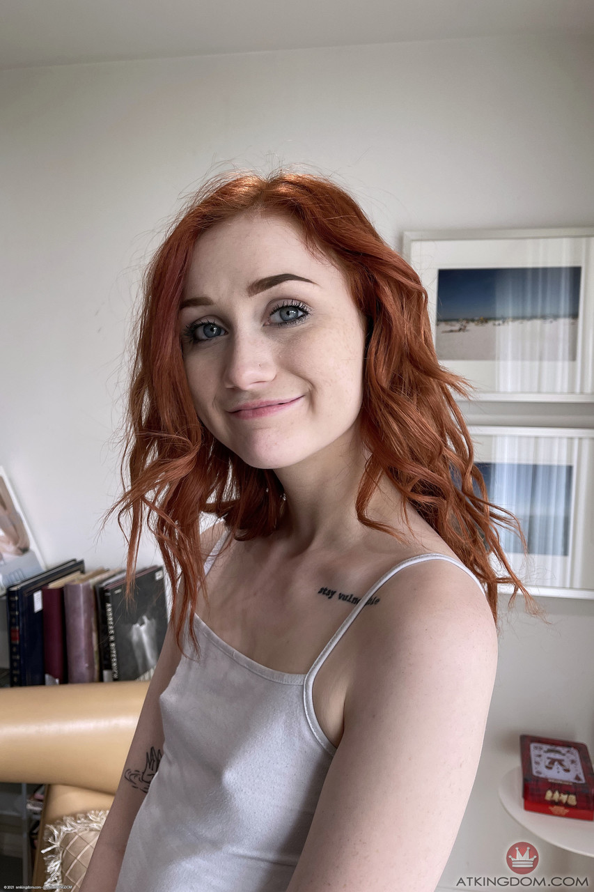 Skinny ginger Scarlet Skies shows her puffy muff & tight asshole up close