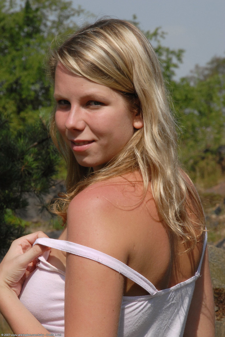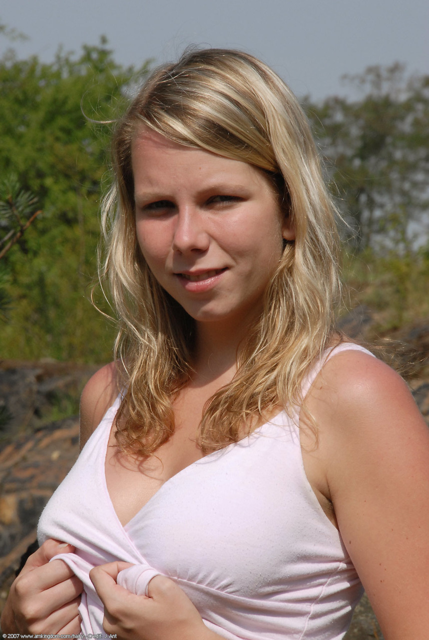 Blonde babe Susie shows her beautiful tits & her hairy pussy outdoors