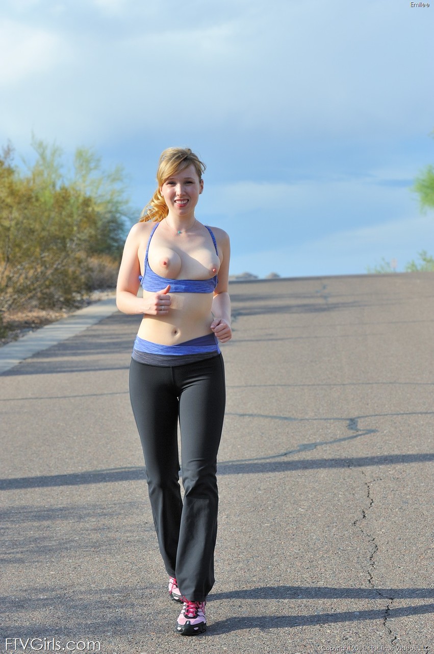 Skinny blonde Emilee exposes her tits while jogging and gets naked at home
