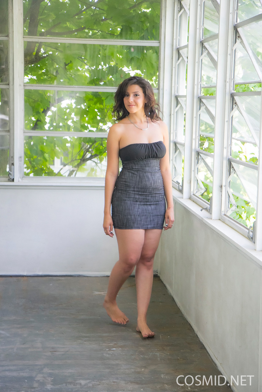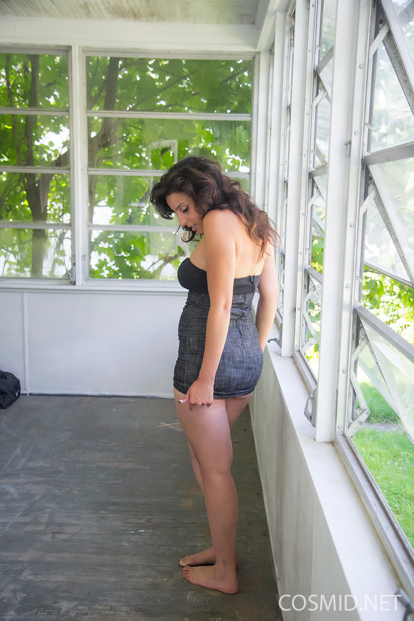 Amateur brunette lifting her tight dress to expose naked ass in sexy upskirt