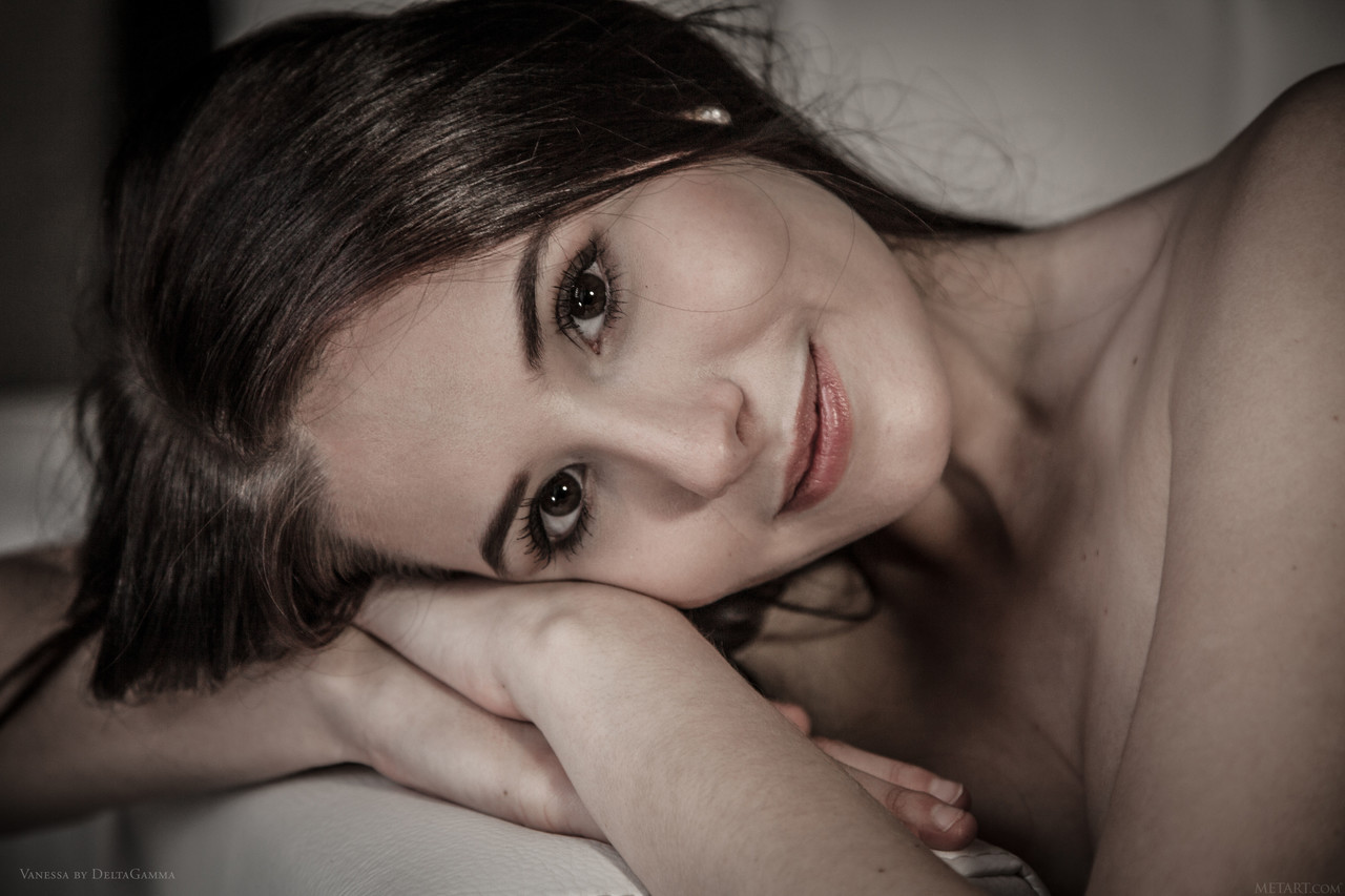 Cute teen Vanessa Angel shows her tiny tits and shaved vagina in a solo